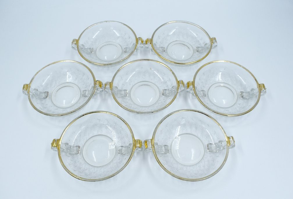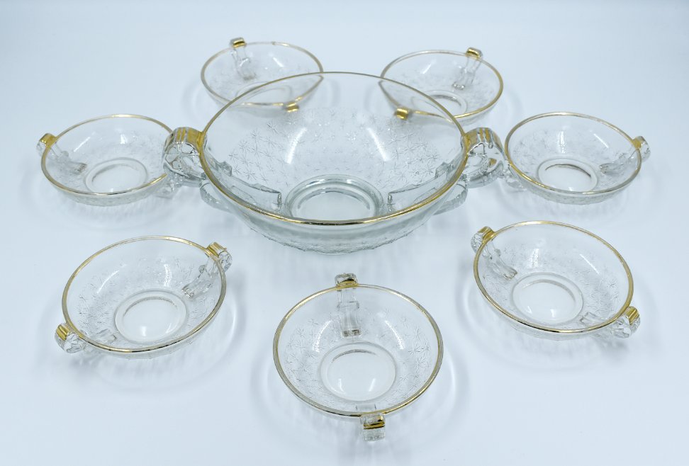 Cet ancien service à salade de fruits ou entremet est en verre gravé de petites étoiles, et bordé d’un liseré doré. La coupe et les coupelles ont chacune deux anses, teintées de doré également, aux formes rappelant le style art-déco.