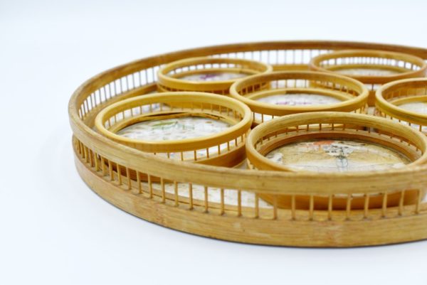 Ce magnifique set est composé d’un plateau, ainsi que de 6 dessous de verre et leur support. Leur fond est incrusté de feuilles séchées imitant papillons et végétaux, sur un fond en dentelle. Le pourtour du plateau et des dessous de verre est en bois clair, le dos du plateau et le support sont en bambou, les dessous de verre sont tout en transparence.